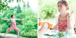 (左)日課となっている朝ヨガ。自身の身体を整えます。